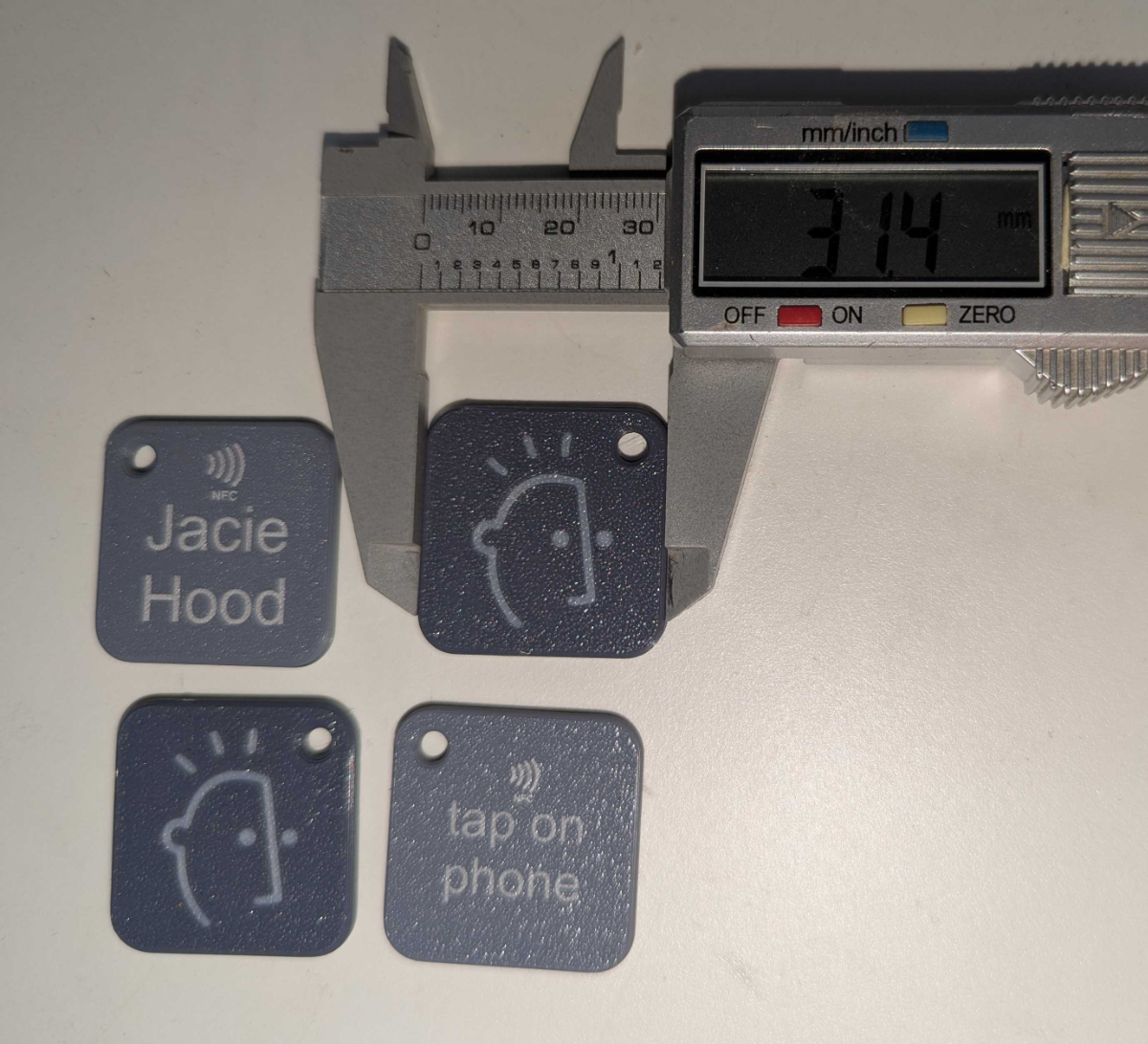 It all fits in a little 3D printed case that you can put on your keychain. They'll even personalize it for you with their galvo laser and show you how that's done as well. You'll walk away with a digital business card, or other useful tag that you can program yourself with a free telephone app! These tags can be written many times so you can easily swap out contact info or other data.